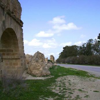 Auf der Fahrt von Thuburbo Majus nach Oudna (Oudhna) und Khelidia (Khlidia) sehen wir rechts neben der Straße die Überreste der einstigen Wasserversorgung aus der Zeit des römischen Kaisers Hadrian. Der Aquädukt versorgte die stetig wachsende Stadt Karthago mit Trinkwasser von der Bergquelle in Zaghouan. Das was wir heute hier sehen ist teilweise zerstört aber im Bereich von Oudna und Mohammedia noch sehr gut erhalten und wird sogar gerade restauriert. Das Foto rechts zeigt Reste des Aquädukts in der Nähe von Zaghouan. Aufgrund ihrer Größe sind diese Bauwerke auch heute noch sehr sehenswert.