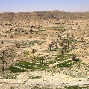 Vom Bergsporn aus kann man die Gegend überblicken, einzelne Feldparzellen, teils mit Palmen bestanden, teils im vollen Grün liegend betrachten und sich fragen, wie die Menschen, die hier lebten, sich von dieser Art Landwirtschaft ernähren konnten. Hier auf den kleinen Terrassen, eingefaßt von Steindämmen, die zum einen den erdigen Boden festhalten sollen und zum anderen die Feuchtigkeit auf den kleinen Feldern sammeln, werden heutzutage nicht mehr überall bestellt. Die kleinen Dämme nennt man Djessur (arabisch: Djussur) und das ganze ist nichts anderes als z.B. der Bau von Parzellen in der Negev-Wüste in Israel, die unter ähnlichen Bedingungen errichtet wurden und mit noch weniger Wasser auskommen müssen.