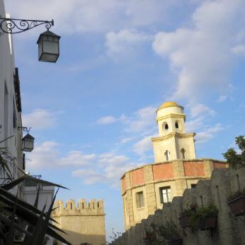 Unter einer Medina stellt man sich natürlich zuerst einmal einen alten und zentral bebauten Handelsplatz in der Stadtmitte oder mindestens in zentraler Lage vor. Das trifft z.B. auf die Medina von Sousse, Mahdia und Sfax zu. Allerdings wurde die Medina von Hammamet-Yasmine komplett neu erbaut und versucht zumindest mit ihrer architektonischen Erscheinung an das landläufige Bild einer Medina anzuknüpfen. Und das ist den Erbauern im wesentlichen gelungen: Sie haben viele Themen aufgegriffen, um die Medina wirkungsvoll und anziehend zu gestalten. Die die Medina umgebende Mauer ist so an das äußere Stadtbild angepasst, das man meinen könnte, man stehe tatsächlich vor einer alten Stadt.