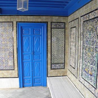 Der weitere Weg führt jetzt in einen großen Hofbereich vor dem Palast, den ein Zaun mit blau gestrichenen Holzelementen umschließt. Auch von hier genießt man einen vorzüglichen Ausblick über die Bucht von Tunis und den Garten unterhalb des Anwesens. Danach kann der Palast besichtigt werden. Man betritt ihn durch ein prächtig gestaltetes Tor und gelangt ins Erdgeschoss des Palastes. Von hier bietet sich ein Rundgang über fast alle Räume dieses noblen Hauses an und es folgt eine Überraschung nach der anderen. Wer sich für arabische Inneneinrichtungen interessiert, kommt hier voll auf seine Kosten. Die Ausstattung der einzelnen Räume ist völlig unterschiedlich und wer den Harem im Bardopalast gesehen hat, weiß wovon ich spreche.